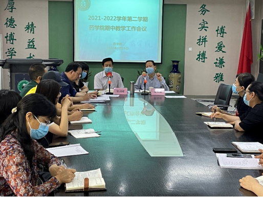 2022年5月26日下午,药学院在立德楼三楼会议室召开了2021-2022学年第二学期教学工作会议。学校教学督导罗秀成教授和张润岐教授莅临指导工作。药学院党政班子、教学指导委员会成员、各专业负责人、教学科全体成员、各教研室主任及实验中心主任以及各班学生代表参加了会议,会议由药学院副院长冯永辉主持。