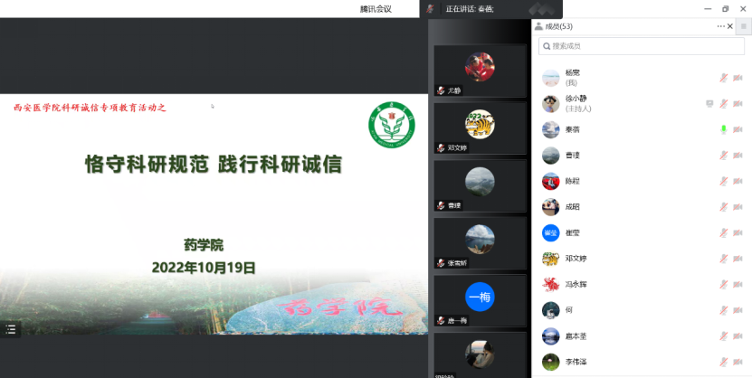 为了更进一步加强科研人员诚信意识,规范科研行为,持续改进科研作风,营造诚实守信的科研环境,药学院于2022年10月19日中午14:00召开了主题为“恪守科研规范 践行科研诚信”的线上专题会议,药学院全体党政班子及全体教师参加了会议。