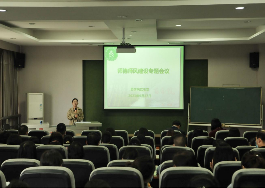 为了进一步强师德师风、促教风学风,9月27日中午,药学院在立德楼开展“师德师风建设月”活动之专题会议,药学院党政领导、全体教职工参加此次会议,会议由药学院党总支副书记王黎主持。