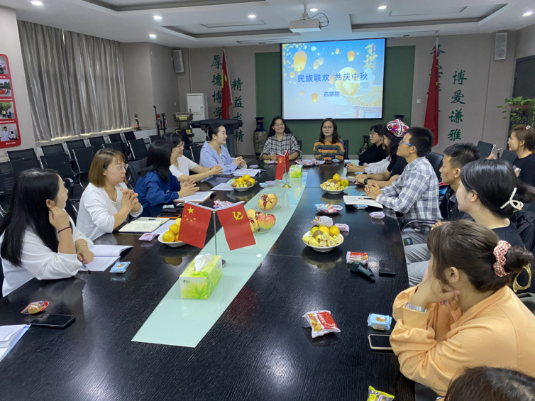在国庆、中秋“双节”即将来临之际,为给各民族学子带来家的温暖和佳节关怀,9月18日,药学院在立德楼三层党员活动室举办了以“民族联欢 共庆中秋”为主题的民族团结一家亲联欢活动。药学院党总支副书记王黎、党总支统战委员/校企合作办公室主任闫平、党总支青年委员/学生科科长杨欣雨、学生第一党支部书记袁欣、新生辅导员赵理达、魏丰以及布依族、白族、维吾尔族、土家族、苗族、彝族等少数民族学生40余人聚一堂,共庆中秋佳节、共话民族团结,活动由少数民族学生工作专干程晨主持。