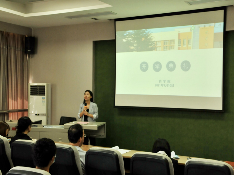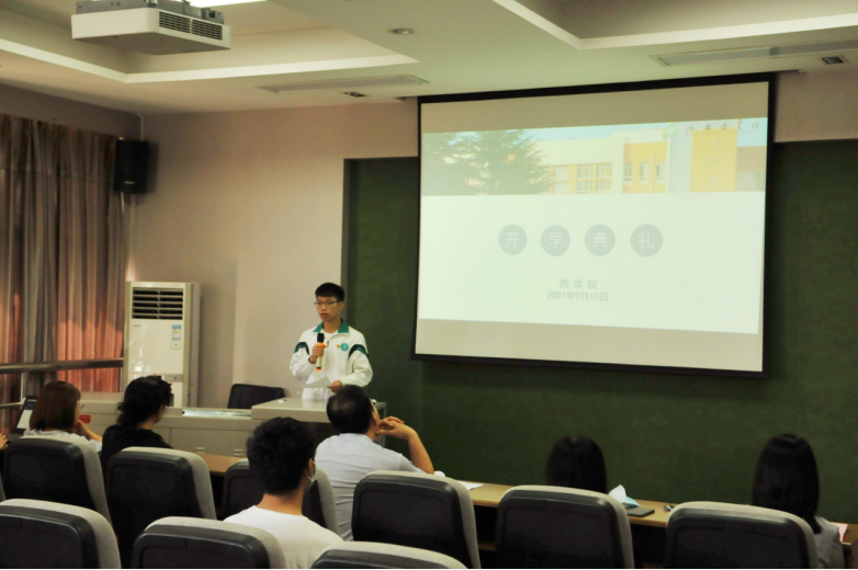 金秋时节,桂香四溢,9月10日中午,药学院2021级新生开学典礼在立德楼三层报告厅顺利举行。药学院院长秦蓓、党总支副书记王黎、副院长冯永辉、党政办主任李冰、校企合作办公室主任闫平、学生科科长杨欣雨、新生辅导员赵理达和魏丰以及学生代表在现场参加了典礼,其余新生通过在线直播的方式观看。开学典礼由党政办主任李冰主持。