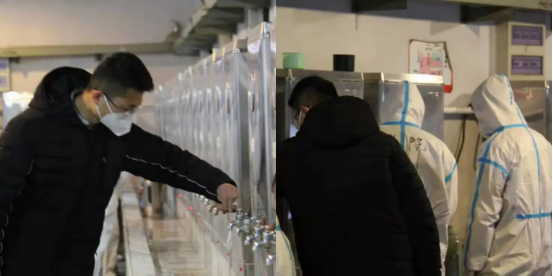 志愿者早餐结束,魏丰老师和青叶“大白”们陆续检查送水车辆、一号水房、二号水房的情况。期间,他要对借用的轮胎缺气车辆进行补气,确保送水运饭车辆正常运转,随后,还要去各楼宇检查水壶取放情况。